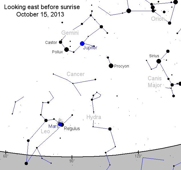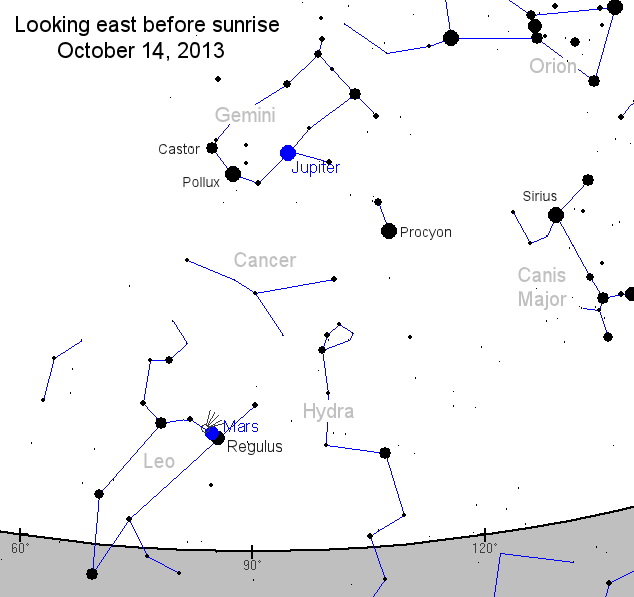 Mars, the 1st-magnitude star Regulus, and Comet ISON have gathered together in the pre-dawn sky only a few degrees apart. Comet ISON is invisible to the naked eye, but Mars and Regulus are bright enough to see without optics. They form a pretty red-blue "double star" that can lead telescopic observers to the comet.